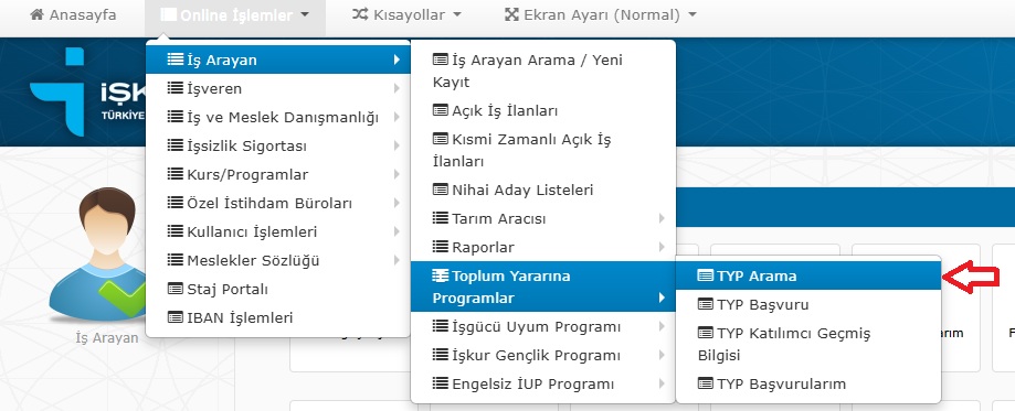 İşkur iş arayan sayfasına girdikten sonra: Online İşlemler > İş Arayan > Toplum Yararına Programlar > TYP Arama menüsünü kullanarak İlinizdeki aktif TYP başvurularını görebilir aynı zamanda başvuru yapabilirsiniz. İlinizde aktif başvuru yoksa İŞKUR’ un bir başka programı olan İşgücü Uyum Programına toplum yararına programlar sekmesinin altından ulaşabilir ve başvuru yapabilirsiniz.